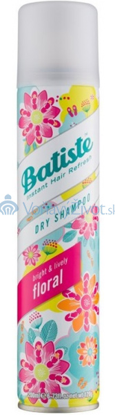 Suchý šampon **Batiste Floral**. Suchý šampon Batiste Flora s květinovou vůní. Šetrně čistí vlasy a odstraňuje přebytečnou mastnotu. Zanechává vlasy svěží, lesklé a provoněné. Suchý šampon Batiste Flora okamžitě osvěžuje zplihlé, mdlé a mastné vlasy. Dodá vlasům novou energii, lesk a hebkost. **Vlastnosti**: · okamžitě čistí vlasy bez použití vody · odstraňuje přebytečný maz · vlasy příjemně provoní **Použití**: Důkladně protřepejte. Nanášejte ze vzdálenosti 30 cm rovnoměrně na vlasy. Jemně vmasírujte a vlasy pročesejte.