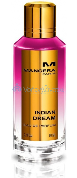 Parfemovaná voda Mancera Indian Dream byla stejně jako ostatní vůně značky vytvořena s cílem potěšit milovníky parfémů spojujících v sobě to nejlepší ze západního a orientálního stylu. Indian Dream nabízí nádherně snivou květinovou vůni s ústředním akordem indického jasmínu. Srdce parfému Ambra, jasmín, růže Základ parfému Vetiver, santalové dřevo, pižmo, vanilka Hlava parfému Pomerančové květy, heliotrope, pelargónie
