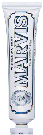 Zubní pasta **Marvis Toothpaste Whitening Mint**. Bohatá a krémová zubní pasta Marvis Toothpaste Whitening Mint dodává intezivní příchuť. Odstraňuje povrchové zabarvení zubů a zároveň redukuje vznik zubního plaku. Chladivá máta zanechává neuvěřitelný pocit svěžesti.