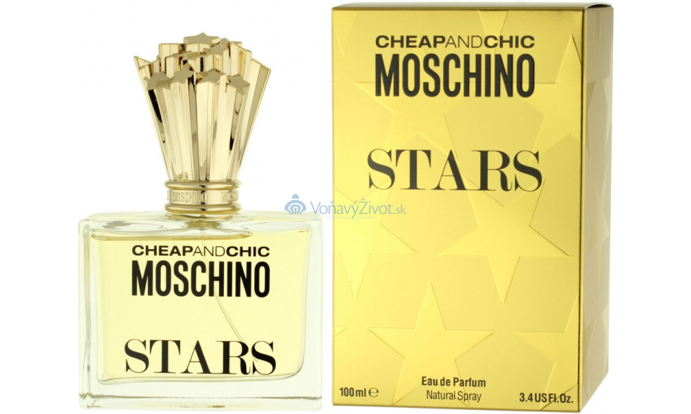 Uvedena na trh v roce 2014. Magická energie citrónové dřeně zahaluje pokožku svou aurou na pozadí květinové hojnosti. Rozezvučí melodii smyslné melodie v objetí zlatých květů pomerančovníku a přitažlivých lupínků jasmínu. Základ sestaven z tónů ambroxanu a naplaveného dřeva je bohatou a radostnou hymnou ženskosti. Moschino Stars vyniká flakonem klasického tvaru obdélníku s okouzlujícím skleněným uzávěrem ve tvaru zářivých zlatých hvězd, oslňujících svou žárem a elegancí. Buket poskládán z hvězd. Podobně jako souhvězdí Kasiopeja, pyšní se nesrovnatelnou krásou. Je zářivá, nádherná a příjemně požitkářská. Srdce parfému Konvalinka, jasmín, pomerančové květy Základ parfému Ambra, vetiver, driftwood, ambroxan Hlava parfému Růže, pivoňka, citrón