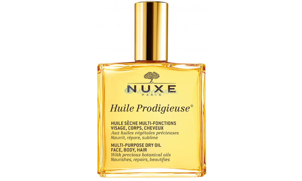 Zkrášlující suchý olej Nuxe Huile Prodigieuse Multi Purpose Dry Oil.Zkrášlující suchý olej Nuxe Huile Prodigieuse Multi Purpose Dry Oil obsahuje vzácné oleje, které dodávají pokožce potřebnou hydrataci. Hloubkově vyživuje pokožku i vlasy. Tento jedinečný olej chrání pokožku, pleť i vlasy. Pokožka je tak regenerovaná a vyživená. Vlasy jsou silnější a plné oslnivého lesku.