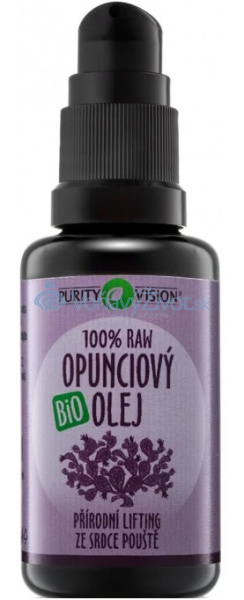 Purity Vision Raw Bio Opunciový olej působí jako přírodní liftingové a revitalizační sérum na drobné vrásky okolo očí a rtů. Je vhodný i pro velmi citlivou a problematickou pleť. Zlepšuje strukturu pleti a zanechává ji zářivou a mladistvou. Semena plodů kaktusu opuncie obsahují pouze 5 % oleje. Z 800 kg ručně sbíraných zralých plodů se získá 25 kg semínek, ze kterých se vylisuje pouze 1 litr oleje. Olej je lisovaný šetrnou metodou za studena, teplota během celého procesu nepřesáhne 42°C. 100% Raw Bio Opunciový olej Purity Vison je právem považován za nejúčinnější zbraň proti stárnutí pleti a tvorbě vrásek. Své jedinečné vlastnosti získává díky vysokému obsahu vitalizujících a regeneračních látek, jakými jsou esenciální mastné kyseliny omega 6 a 9 a velké množství přírodního antioxidantu vitamínu E. Olej dále obsahuje aminokyseliny, které podporují tvorbu kolagenu, a urychlují tak regeneraci buněk. Při pravidelném používání Opunciového oleje se vaše pokožka znatelně rozzáří a zpevní. Účinky Raw Bio Opunciového oleje: - podporuje tvorbu kolagenu a obnovuje přirozenou pružnost a pevnost pleti - vyhlazuje drobné vrásky okolo očí a úst - zanechává pleť zářivou a poradí si i s kruhy pod očima - rychle se vstřebává do všech vrstev pokožky a nezanechává mastný film - pomáhá regulovat tvorbu kožního mazu, stahuje a čistí póry - udržuje v pleti vlhkost a dodává ji dlouhodobou svěžest - výborně regeneruje nehty, zlepšuje jejich pružnost, díky čemuž se pak méně lámou - poradí si také se suchými a poškozenými vlasy, stačí po umytí vlasů vmasírovat pár kapek do ještě mokrých konečků