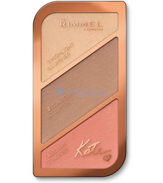 Konturovací paletka **Rimmel London Kate**. Konturovací paletka Rimmel London Kate obsahuje rozjasňující, bronzující pudr a tvářenku. Mějte bezchybnou, svěží a rozjasněnou pleť s konturovací paletkou Rimmel London Kate. **Poznámka**: *Vyobrazený odstín může být spíše orientační, záleží na nastavení barev Vašeho monitoru.*