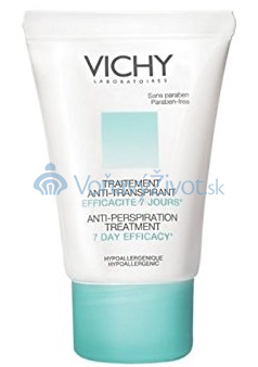 Antiperspirant **Vichy 7 Day**. Antiperspirant Vichy 7 Day zanechává pokožku zdravou, jemná pokožka a s příjemným pociten po celých 48 hodin. Cílený účinek proti vlhkosti a pachu. Bez alkoholu - hypoalergenní. Testováno pod dermatologickou kontrolou. **Použití**: Naneste v tenké vrstvě na čistou a suchou pokožku.